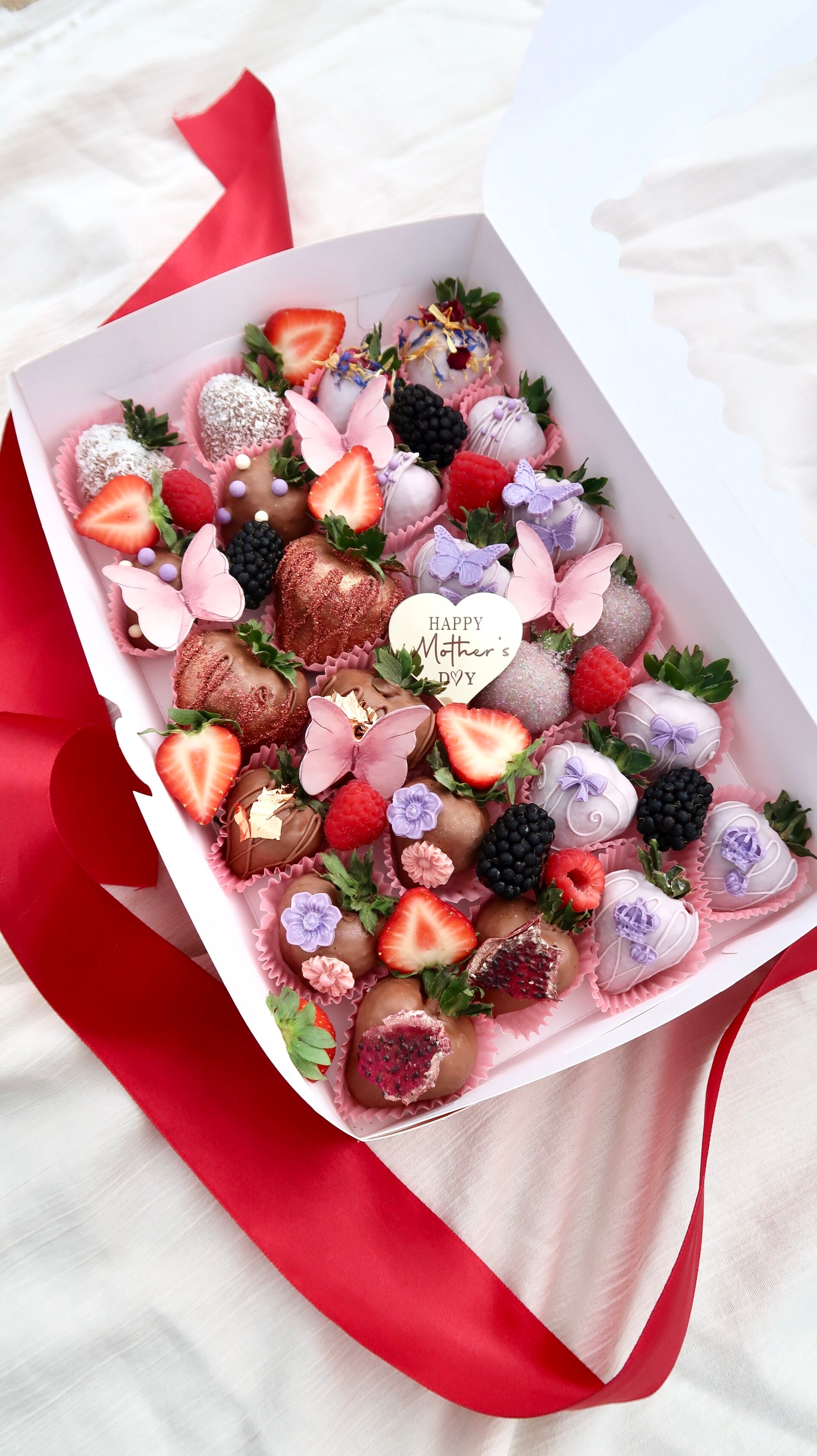A beautiful box of chocolate strawberries dedicated to all the amazing mothers whose love and devotion inspire us everyday. We chose purple as our signature theme - a colour that symbolises admiration, appreciation, and the beauty of a mother's unconditional love.
